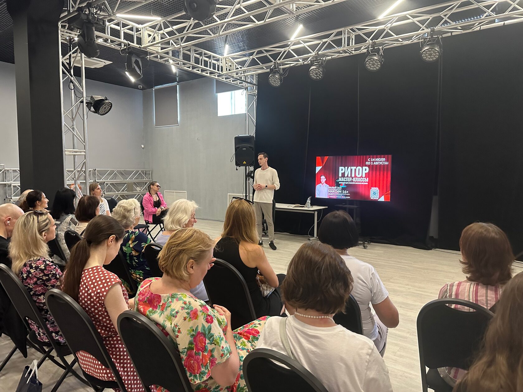 В малом зале Культурно-досугового центра «Максим» прошло первое из девяти занятий бесплатного авторского курса «Ритор» Михаила Мигунова, режиссёра, педагога и руководителя «Театра на Ланском».